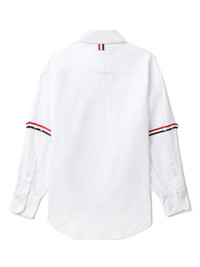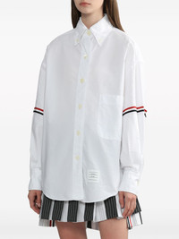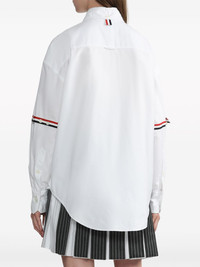 RWB stripe-trim cotton shirt Cut from crisp white cotton poplin to hold the relaxed shape, this shirt is made undeniably Thom Browne with its signature RWB stripe arm bands – these ones come kitted with buttons to adjust the fit of the sleeves. Highlights - White - Cotton - Poplin texture - Rwb stripe - Logo patch to the front - Oversized pointed collar - Front button placket - Chest patch pocket - Long sleeves - Buttoned cuffs - Curved hem Imported Composition Cotton 100%