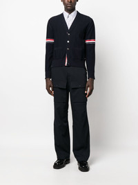 RWB Stripe V-neck cardigan The New York-based brand Thom Browne is one for presenting traditional silhouettes with contemporary finishes. This knitted cardigan displays the ethos, thanks to the classic virgin wool design that is contrasted by signature RWB striped trims. Highlights - Navy blue - Virgin wool - V-neck - Front button fastening - Rwb stripe - Two front patch pockets - Long sleeves Made in Italy Composition Virgin Wool 100% SIZE & FIT Model measurements Height 6 ft 2 in(1.87 m) Bust/Chest 36.41 in(92.5 cm) Hips 37 in(94 cm) Waist 29.52 in(75 cm) FittingInformation Designed for a relaxed fit, this piece allows for comfort and movement when worn Made with a midweight knit, this piece offers some stretch This piece fits true to size – take your usual size