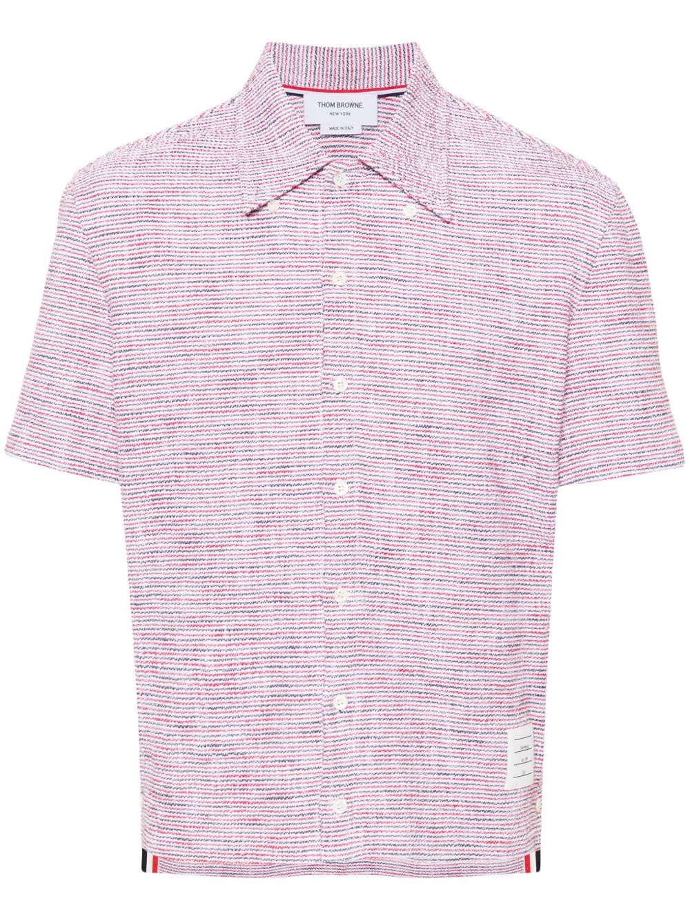 RWB-striped tweed shirt Highlights - Cardinal red/white/navy blue - Wool blend - Tweed - Horizontal stripe pattern - Pointed flat collar - Short sleeves - Logo tag - Signature grosgrain loop tab - Short side slits - Rwb stripe - High-low hem - Front button placket Made in Italy Composition Wool 80%, Polyamide 18%, Spandex/Elastane 2% SIZE & FIT Model measurements Height 6 ft 2 in(1.88 m) Bust/Chest 35.03 in(89 cm) Hips 35.82 in(91 cm) Waist 27.95 in(71 cm) FittingInformation Designed for a relaxed fit, this piece allows for comfort and movement when worn Made from a midweight non-stretch fabric, this piece offers minimal elasticity when worn This piece fits true to size – take your usual size