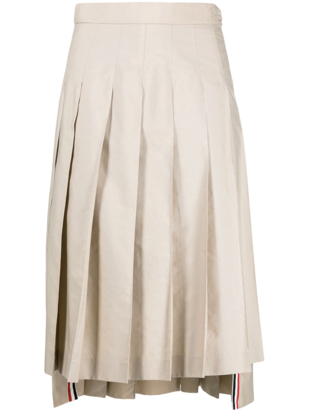RWB-tab pleated midi skirt Highlights - Khaki - Typewriter cloth - Box-pleat design - Signature grosgrain loop tab - Rwb stripe - Side button and zip fastening - High-waisted - Knee-length - Signature grosgrain side tabs - High-low hem Made in Italy Composition Polyolefin 65%, Cotton 35% SIZE & FIT Model measurements Height 5 ft 9 in(1.76 m) Bust/Chest 31.88 in(81 cm) Hips 35.43 in(90 cm) Waist 24.8 in(63 cm) FittingInformation Designed with an asymmetric hem, this skirt is intended to be worn high on the waist Made from a midweight non-stretch fabric This piece fits true to size – take your usual size Measurement HIPS 36.22 in(92 cm) LENGTH 31.1 in(79 cm) WAIST 26.77 in(68 cm)