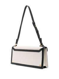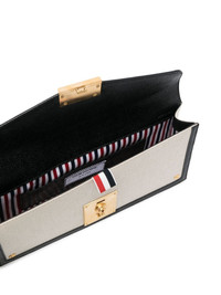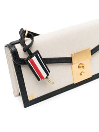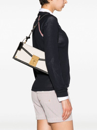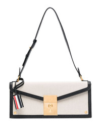 RWB-tag canvas shoulder bag Presented in a horizontal shape, this shoulder bag by Thom Browne is crafted from canvas and detailed with a signature RWB tag. The structured silhouette benefits from an adjustable handle, while a branded lining adds a final touch. Highlights - Light beige/black - Canvas - Faux-leather tag - Rwb stripe - Foldover top - Clasp fastening - Adjustable top handle - Main compartment - Internal slip pocket - Rwb stripe lining Made in Italy Composition Outer: Cotton 100%, Calf Leather 100% Lining: Recycled Polyester 68%, Polyester 27%, Acrylic 5% SIZE & FIT Model measurements Height 5 ft 11 in(1.8 m) Bust/Chest 33.07 in(84 cm) Hips 37 in(94 cm) Waist 25.59 in(65 cm) Measurement DEPTH 2.36 in(6 cm) HANDLE 10.62 in(27 cm) HEIGHT 5.11 in(13 cm) WIDTH 11.81 in(30 cm)