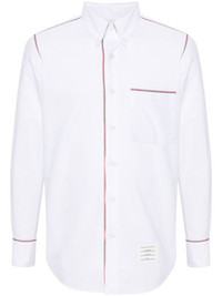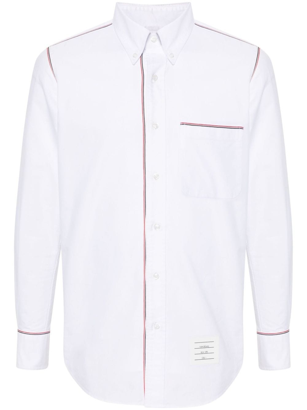 RWB-trim cotton shirt A signature of the brand, the RWB stripes celebrate Thom Browne's American roots by mirroring the USA's national colours. Here, the trademark punctuates this cotton shirt, trimming the silhouette for an instantly recognisable look. Highlights - White - Cotton - Interlock twill weave - Rwb stripe trim - Logo patch to the front - Button-down collar - Front button fastening - Long sleeves with buttoned cuffs - Hem gusset - Curved hem Made in Italy Composition Cotton 100% SIZE & FIT Model measurements Height 6 ft 2 in(1.87 m) Bust/Chest 38.18 in(97 cm) Hips 36.61 in(93 cm) Waist 29.13 in(74 cm) Measurement CHEST 42 in(106.7 cm) SLEEVE LENGTH 25.98 in(66 cm) LENGTH 29.48 in(74.9 cm) WAIST 42 in(106.7 cm) Shoulder Width 17.51 in(44.5 cm) FittingInformation Designed for a regular fit, allowing for a comfortably loose fit throughout the body Made from a midweight fabric This piece fits true to size – take your usual size
