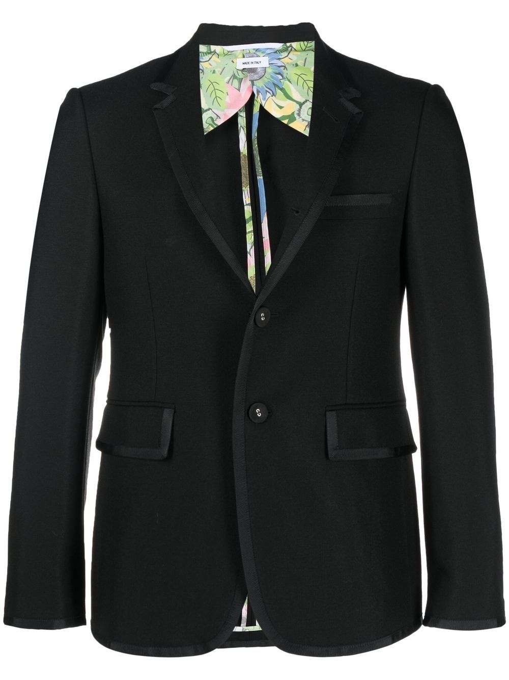 satin-trim wool blazer Thom Browne reinvents the tuxedo jacket for modern wear with this tailored wool piece. Crafted in Italy, the single-breasted jacket is trimmed in satin at the edges for a sophisticated finish. Made in Italy Composition Lining: Cotton 100%, Cupro 100% Outer: Wool 100% SIZE & FIT Model measurements Height 6 ft 2 in(1.87 m) Bust/Chest 35.82 in(91 cm) Hips 35.43 in(90 cm) Waist 27.95 in(71 cm) FittingInformation This piece fits true to size. We recommend you get your regular size Cut for a slim fit Made with a mid-weight non-stretch fabric Washing instructions Dry Clean Only