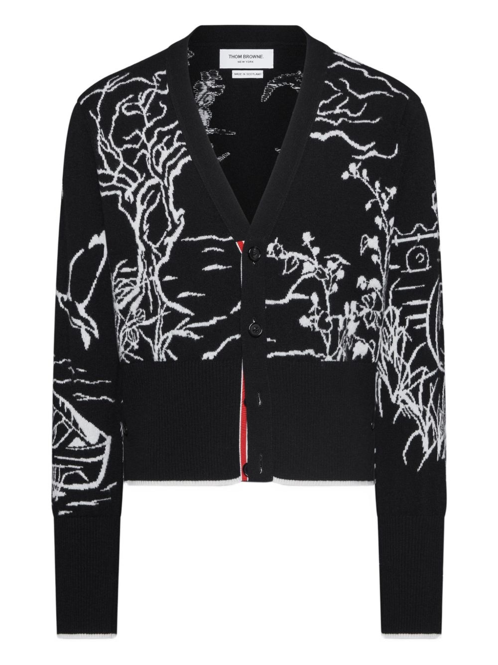 scenic intarsia cardigan Highlights - Black - V-neck - Intarsia pattern - Front button fastening - Ribbed cuffs - Signature grosgrain ribbon trim Made in Italy Composition Cashmere 100% Washing instructions Read Manufacturer Guidelines