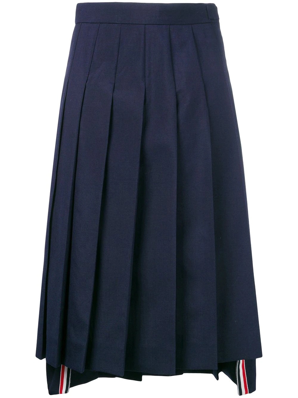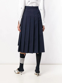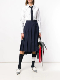 School Uniform Pleated Skirt A wardrobe of reimagined - but never boring - classics, Thom Browne’s Spring/Summer 2019 collection takes uniform dressing to chic new heights. This navy wool blend School Uniform Pleated Skirt from Thom Browne features a high waist, a side zip closure, a high low hemline, a mid-length, branded gold-tone hardware, knife pleats and a tri-stripe grosgrain trim. Made in Italy Composition Polyester 50%, Wool 50% SIZE & FIT Model measurements Height 5 ft 10 in(1.77 m) Bust/Chest 31.49 in(80 cm) Hips 33.46 in(85 cm) Waist 23.62 in(60 cm) Washing instructions Dry Clean Only