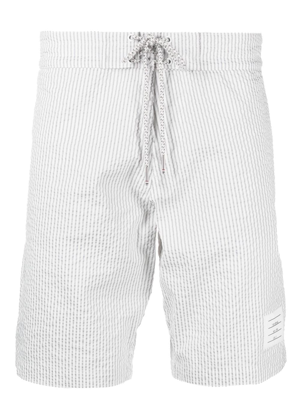 seersucker stripe-print swim shorts Highlights - Medium grey/white - Seersucker texture - Vertical stripe print - Elasticated drawstring waistband - Two side slit pockets - Signature 4-bar tab - Rear flap pocket - Rwb stripe - Knee-length - Be mindful to try on swimwear over your own garments. Made in Italy Composition Outer: Polyamide 42%, Elastomultiester 30%, Polyester 28% Lining: Polyester 100%