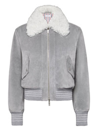 shearling-collar suede jacket Highlights - Medium grey - Shearling collar - Front zip fastening - Ribbed hem - Side flap pockets Made in Italy Composition Sheep Skin/Shearling 100% Washing instructions Specialist Cleaning
