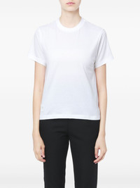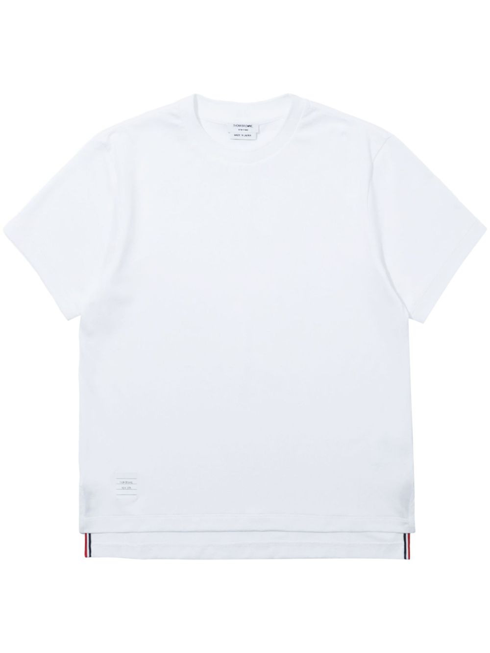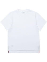 side slits relaxed T-shirt You can't go wrong with a classic white T-shirt. Especially if it's from Thom Browne and comes with the brand's signature RWB grosgrain details. You don't need anything else. Highlights - White - Cotton - Crew neck - Short sleeves - Logo patch to the front - Signature grosgrain side tabs - Signature grosgrain loop tab - High-low hem Made in Italy Composition Cotton 100% SIZE & FIT Model measurements Height 5 ft 10 in(1.77 m) Bust/Chest 32.28 in(82 cm) Hips 35.82 in(91 cm) Waist 24.8 in(63 cm) Measurement SLEEVE LENGTH 3.54 in(9 cm) Shoulder Width 14.56 in(37 cm) LENGTH 22.44 in(57 cm) WAIST 32.28 in(82 cm) BUST 32.28 in(82 cm)
