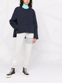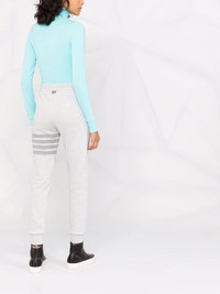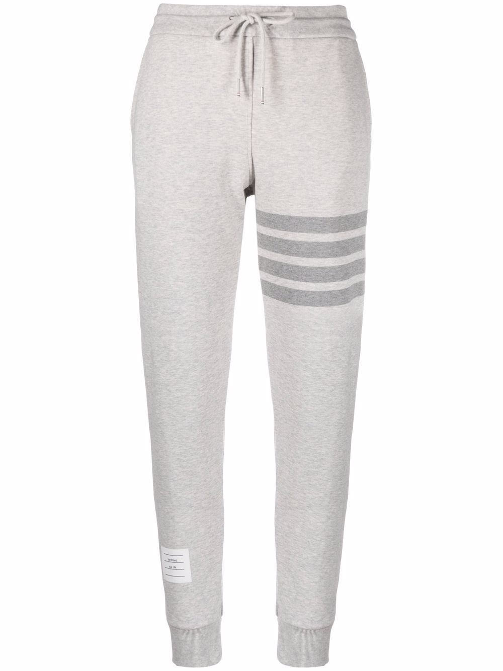signature 4-Bar Stripe track pants Thom Browne's signature 4-Bar stripe decorates the left leg of these slim cut track pants for AW21. Fabricated in a pastel grey cotton, they are detailed with the label's RWB stripe motif. Imported Composition Cotton 100% SIZE & FIT Model measurements Height 5 ft 9 in(1.76 m) Bust/Chest 31.88 in(81 cm) Hips 35.43 in(90 cm) Waist 24.8 in(63 cm) Measurement FRONT RISE 12.2 in(31 cm) HIPS 38.58 in(98 cm) WAIST 26.77 in(68 cm) FittingInformation This piece fits true to size. We recommend you get your regular size Cut for a slim fit Made with a mid-weight fabric Washing instructions Machine Wash