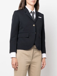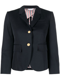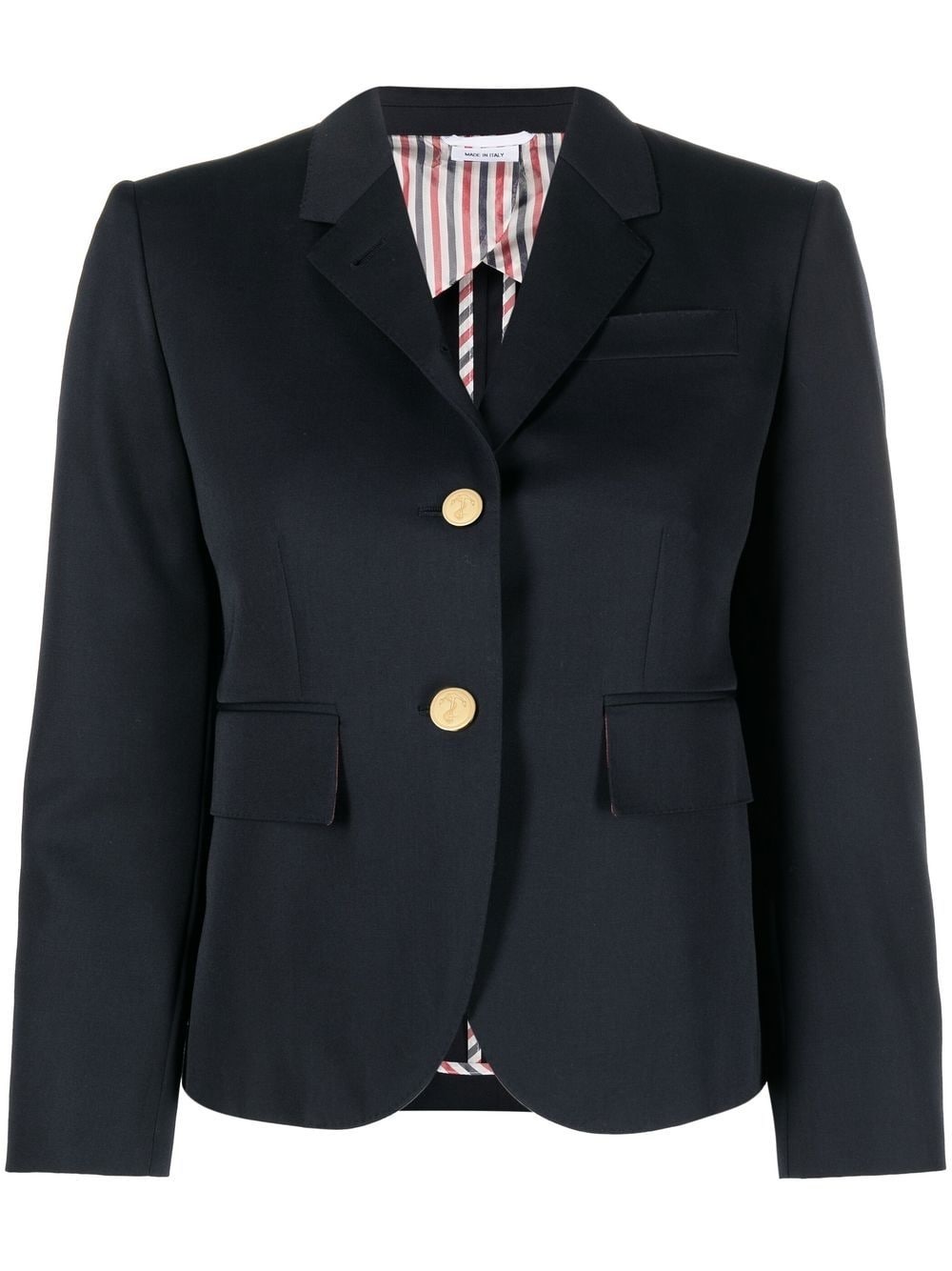 single-breasted blazer Following the brand's classic style, this single-breasted blazer from Thom Browne's SS23 arrives in a blue tone, enhanced by gold-tone buttons on the front. Its design is crafted from wool and features notched lapels. Made in Italy Composition Lining: Cupro 100% Outer: Wool 100% SIZE & FIT Model measurements Height 5 ft 10 in(1.77 m) Bust/Chest 35.03 in(89 cm) Hips 35.03 in(89 cm) Waist 23.62 in(60 cm) Washing instructions Dry Clean Only