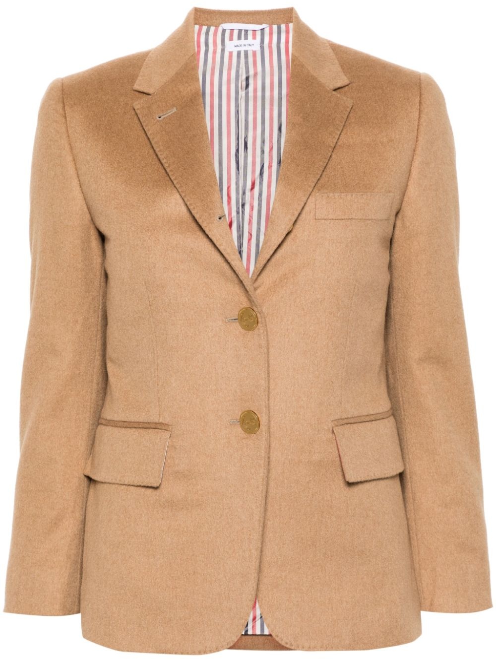 single-breasted blazer Highlights - Light brown - Camel hair - Notched lapels - Chest welt pocket - Shoulder pads - Long sleeves - Buttoned cuffs - Two side flap pockets - English rear vents - Internal jetted pockets - Striped lining - Front button fastening Made in Italy Composition Outer: Camel Hair 100% Lining: Cupro 100% SIZE & FIT Model measurements Height 5 ft 10 in(1.77 m) Bust/Chest 34.25 in(87 cm) Hips 37.4 in(95 cm) Waist 29.13 in(74 cm) FittingInformation Designed for a slim fit that sits just away from the body offering a close yet comfortable fit The internal shoulder pads offer a structured shape Made from a midweight non-stretch fabric This piece fits true to size – take your usual size