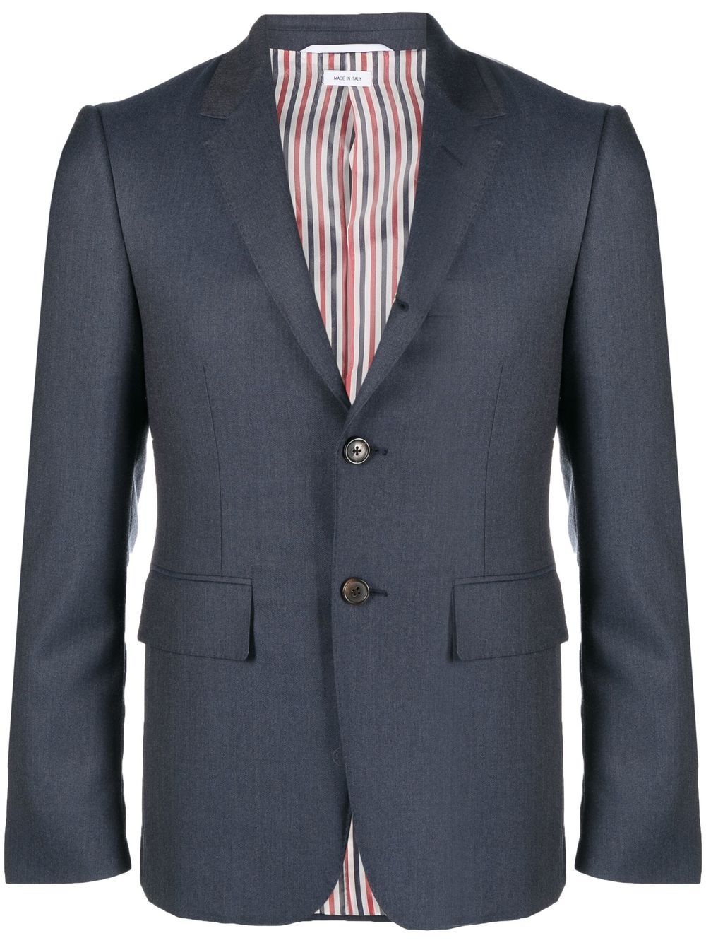 single-breasted button blazer navy blue wool classic lapels front button fastening long sleeves chest welt pocket two front flap pockets Made in Italy Composition Outer: Wool 100% Lining: Cupro 100% SIZE & FIT Model measurements Height 6 ft 2 in(1.88 m) Bust/Chest 36.61 in(93 cm) Hips 35.82 in(91 cm) Waist 27.95 in(71 cm) Washing instructions Dry Clean Only