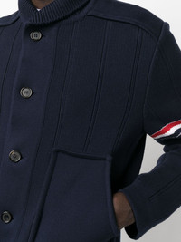 single-breasted button-fastening shirt jacket Instantly recognisable as Thom Browne by the signature grosgrain loop, this single-breasted coat is constructed from sophisticated materials and has a sleek silhouette that reflects the brand's tailored approach to garment construction. Highlights - Navy blue - Cotton - Rwb stripe - Long sleeves - Front button fastening Made in Italy Composition Cotton 85%, Cashmere 15% SIZE & FIT Model measurements Height 6 ft 2 in(1.87 m) Bust/Chest 36.41 in(92.5 cm) Hips 37 in(94 cm) Waist 29.52 in(75 cm) FittingInformation Designed for a relaxed fit, this piece allows for comfort and movement when worn Made from a midweight non-stretch fabric, this piece offers minimal elasticity when worn This piece fits true to size – take your usual size