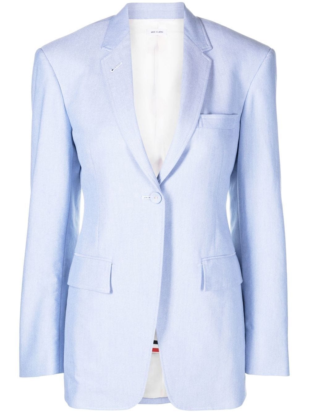 single-breasted cotton blazer light blue cotton silk lining notched lapels chest welt pocket front button fastening two front flap pockets long sleeves signature grosgrain loop tab Made in Italy Composition Outer: Silk 100%, Cotton 100% SIZE & FIT Model measurements Height 5 ft 11 in(1.8 m) Bust/Chest 31.88 in(81 cm) Hips 35.03 in(89 cm) Waist 24.01 in(61 cm)