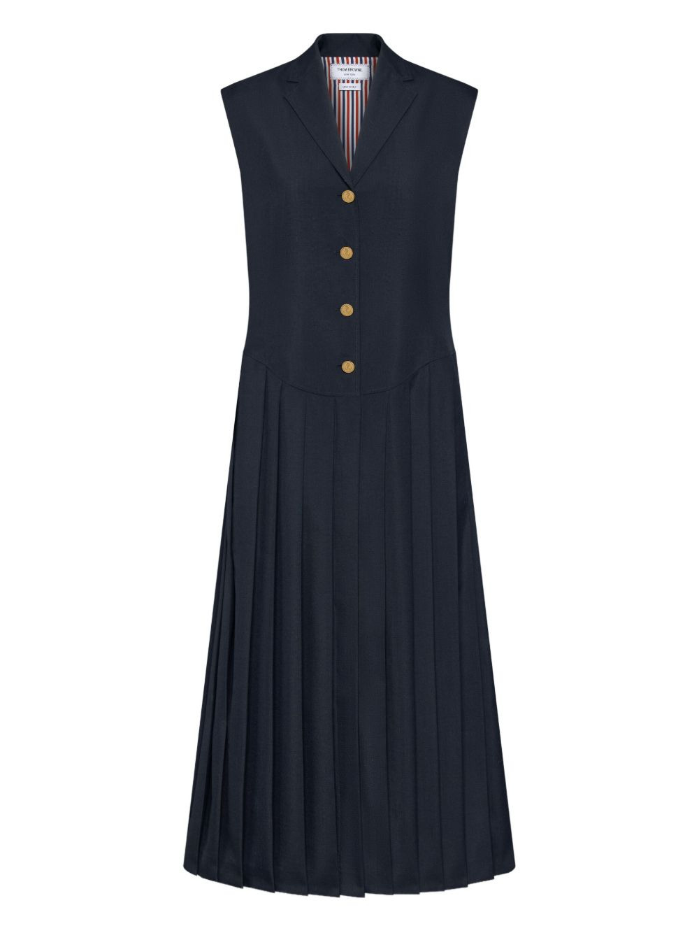 sleeveless pleated dress Highlights - Navy blue - Pleated skirt - Lapel collar - Sleeveless - Front button fastening - Gold-tone buttons Made in Italy Composition Outer: Wool 50%, Polyester 50% Lining: Silk 100% SIZE & FIT Measurement HIPS 41.73 in(106 cm) LENGTH 49.6 in(126 cm) WAIST 28.34 in(72 cm) BUST 30.7 in(78 cm) Shoulder Width 15.35 in(39 cm) Washing instructions Read Manufacturer Guidelines