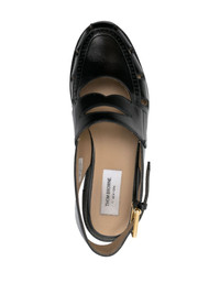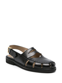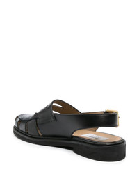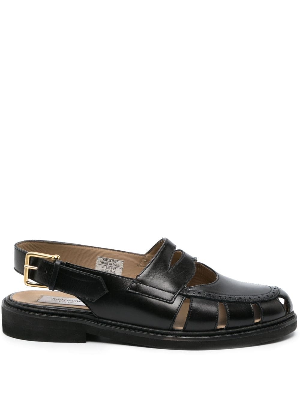 slingback cut-out sandals Thom Browne takes inspiration from classic school uniform designs to create these sandals, presented in a slingback silhouette. Cut-out detailing at the toe elevate the sleek black leather pair. Highlights - Black - Calf leather - Cut-out detailing - Round toe - Buckle-fastening slingback strap - Branded insole - Flat rubber sole Made in Italy Composition Outer: Calf Leather 100% Lining: Calf Leather 100% Sole: Rubber 100% SIZE & FIT Measurement HEEL 1.37 in(3.5 cm) Sole height 0.59 in(1.5 cm)