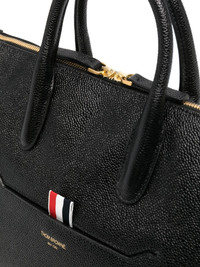 small leather tote bag Presented in a small size, this tote bag by Thom Browne is crafted from pebble leather and accented with the signature RWB tab -- one of the label's most recognisable icons. Besides the front slip pocket, it benefits from a spacious main compartment and comes with a detachable shoulder strap. Highlights - Black - Calf leather - Pebbled texture - Slip pocket to the front - Logo stamp to the front - Signature grosgrain loop tab - Top zip fastening - Main compartment - Internal zip-fastening pocket - Rwb stripe lining - Two top handles - Adjustable detachable shoulder strap Imported Composition Outer: Calf Leather 100% Lining: Polyester 100% SIZE & FIT Model measurements Height 6 ft 2 in(1.87 m) Bust/Chest 36.41 in(92.5 cm) Hips 37 in(94 cm) Waist 29.52 in(75 cm) Measurement DEPTH 6.69 in(17 cm) HANDLE 3.93 in(10 cm) HEIGHT 9.05 in(23 cm) STRAP 19.68 in(50 cm) WIDTH 11.81 in(30 cm)