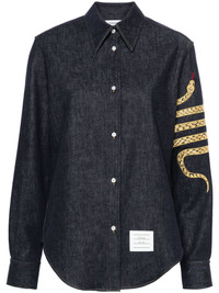 snake 4-Bar denim shirt Highlights - Dark blue - Cotton - Denim - Contrast stitching - Pointed flat collar - Long sleeves with buttoned cuffs - Embroidered 4-bar snake to the sleeve - Logo patch to the hem - Rear signature grosgrain loop tab - Rear keeper loop - Curved hem - Front button placket Made in Italy Composition Cotton 100% SIZE & FIT Model measurements Height 5 ft 11 in(1.8 m) Bust/Chest 32.67 in(83 cm) Hips 36.22 in(92 cm) Waist 24.4 in(62 cm) FittingInformation Designed for a relaxed fit, this piece allows for comfort and movement when worn Sturdy and hard-wearing, this denim piece offers no stretch This piece fits true to size – take your usual size