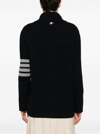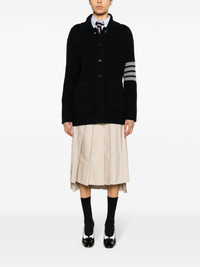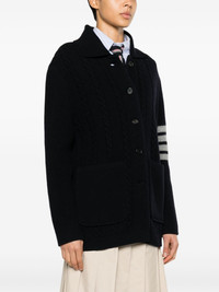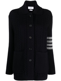 spread-collar cable-knit cardigan Highlights - Navy blue - Virgin wool-cotton blend - Cable knit - Signature 4-bar stripe - Grosgrain ribbon trim - Rwb stripe - Spread collar - Front button fastening - Long sleeves - Two front patch pockets Made in Italy Composition Virgin Wool 75%, Cotton 25% SIZE & FIT Model measurements Height 5 ft 9 in(1.76 m) Bust/Chest 31.88 in(81 cm) Hips 35.43 in(90 cm) Waist 24.8 in(63 cm) FittingInformation Designed for a relaxed fit, this piece allows for comfort and movement when worn Made with a midweight knit, this piece offers some stretch This piece fits true to size – take your usual size