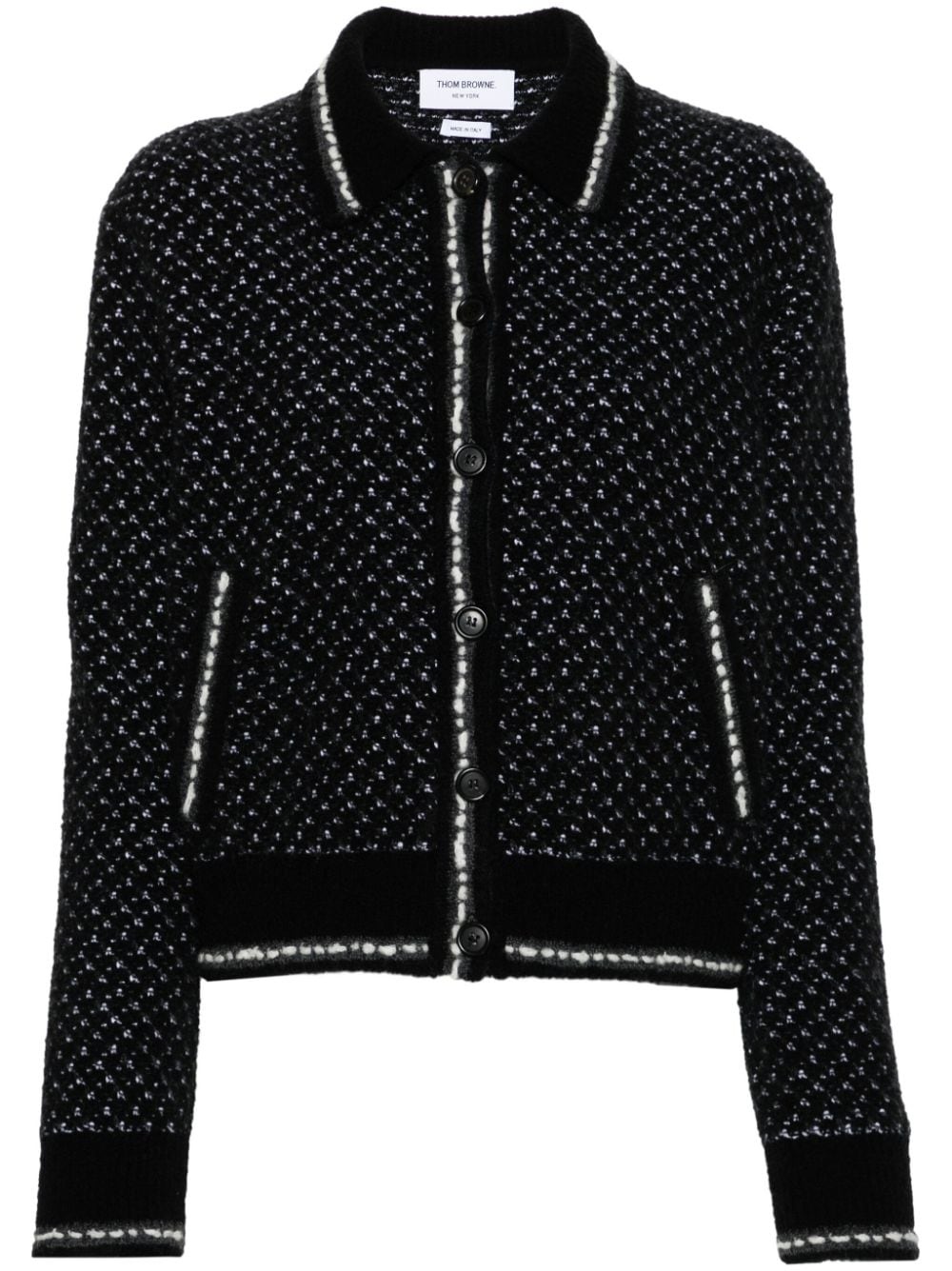 spread-collar tweed bomber jacket Highlights - Black/white - Virgin wool blend - Tweed - Boucle construction - Striped ribbed trim - Spread collar - Front button fastening - Long sleeves - Two side welt pockets - Straight hem Made in Italy Composition Virgin Wool 80%, Polyamide 20% SIZE & FIT Model measurements Height 5 ft 10 in(1.77 m) Bust/Chest 33.07 in(84 cm) Hips 37 in(94 cm) Waist 24.8 in(63 cm) FittingInformation Designed for a relaxed fit, this piece allows for comfort and movement when worn The ribbed hem offers a close, comfortable fit Made with a midweight knit, this piece offers some stretch This piece fits true to size – take your usual size Washing instructions Dry Clean Only