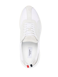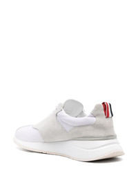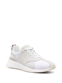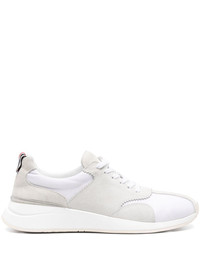 Sprinter panelled sneakers Thom Browne taps into activewear codes with these white sneakers. Crafted from technical fabric and supple suede, they boast a chunky low-top silhouette with jagged and curved lines. They are grounded on a wedge rubber sole and feature a signature grosgrain loop tab at the heel as a final branded note. Highlights - White/grey - Suede panelling - Embossed logo to the rear - Signature grosgrain loop tab - Round toe - Front lace-up fastening - Branded insole - Flat rubber sole Made in Italy Composition Outer: Calf Suede 100%, Polyester 73%, Polyamide 27% Lining: Calf Leather 100% Sole: Rubber 100%