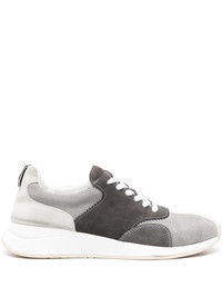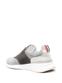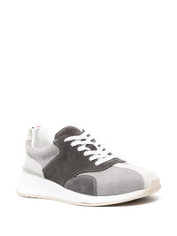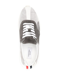 Sprinter suede sneakers Thom Browne’s sneakers are crafted from supple panels of suede in a neutral grey colourway, reflecting the brand’s refined aesthetic. They’re finished with a signature RWB grosgrain loop at the heel counter. Highlights - Medium grey/light grey/white - Calf suede - Panelled design - Zigzag edge - Signature grosgrain loop tab - Round toe - Front lace-up fastening - Padded ankle - Pull-tab at the heel - Leather lining - Branded insole - Chunky rubber sole Made in Italy Composition Suede 100% SIZE & FIT Measurement HEEL 1.69 in(4.3 cm) Sole height 0.9 in(2.3 cm)