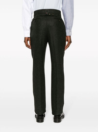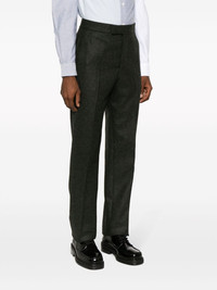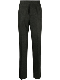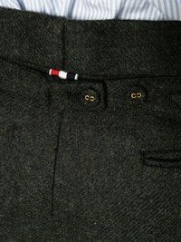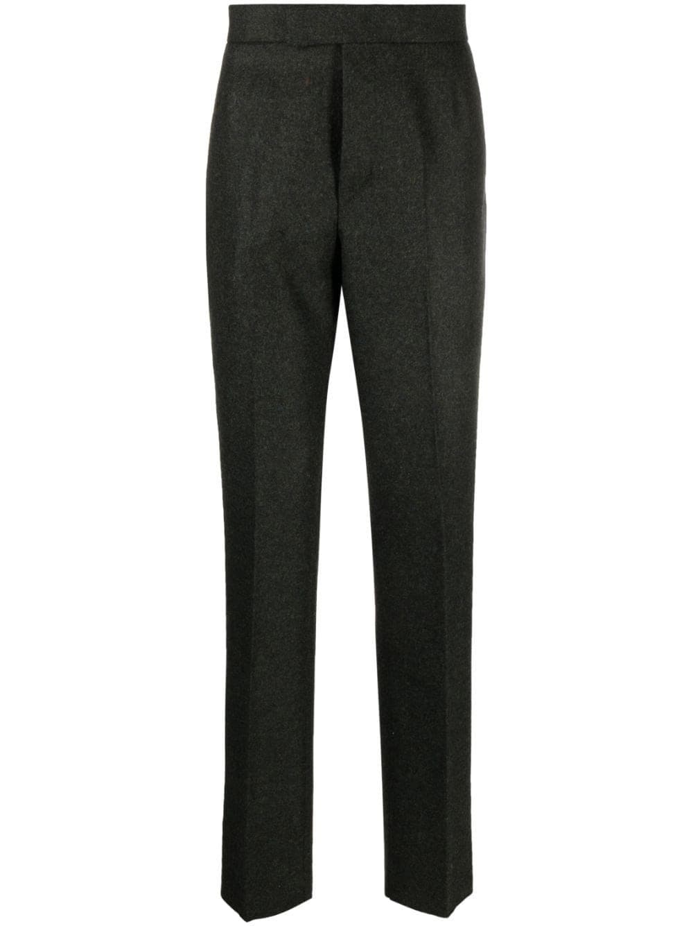 straight-leg wool trousers Thom Browne showcases its tailoring expertise with these trousers. Crafted from wool, they are cut to a timeless straight-leg silhouette and feature an adjustable backstrap alongside the signature RWB stripe. Highlights - Dark green - Wool - Concealed front fastening - Two side slit pockets - Two rear welt pockets - Straight leg Made in Italy Composition Outer: Wool 100% Lining: Cupro 100%