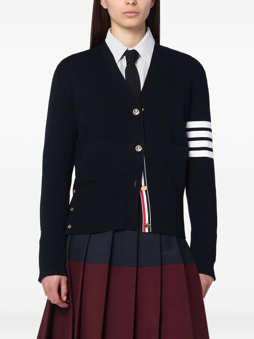 stripe cardigan Highlights - Navy blue - 4-bar stripe - Button fastening - Ribbed trims - Buttoned cuffs Made in Italy Composition Merino 100% Washing instructions Read Manufacturer Guidelines