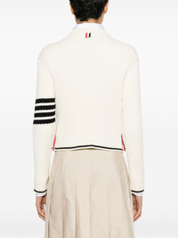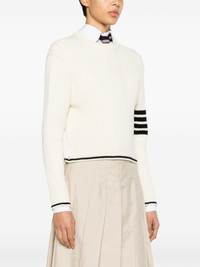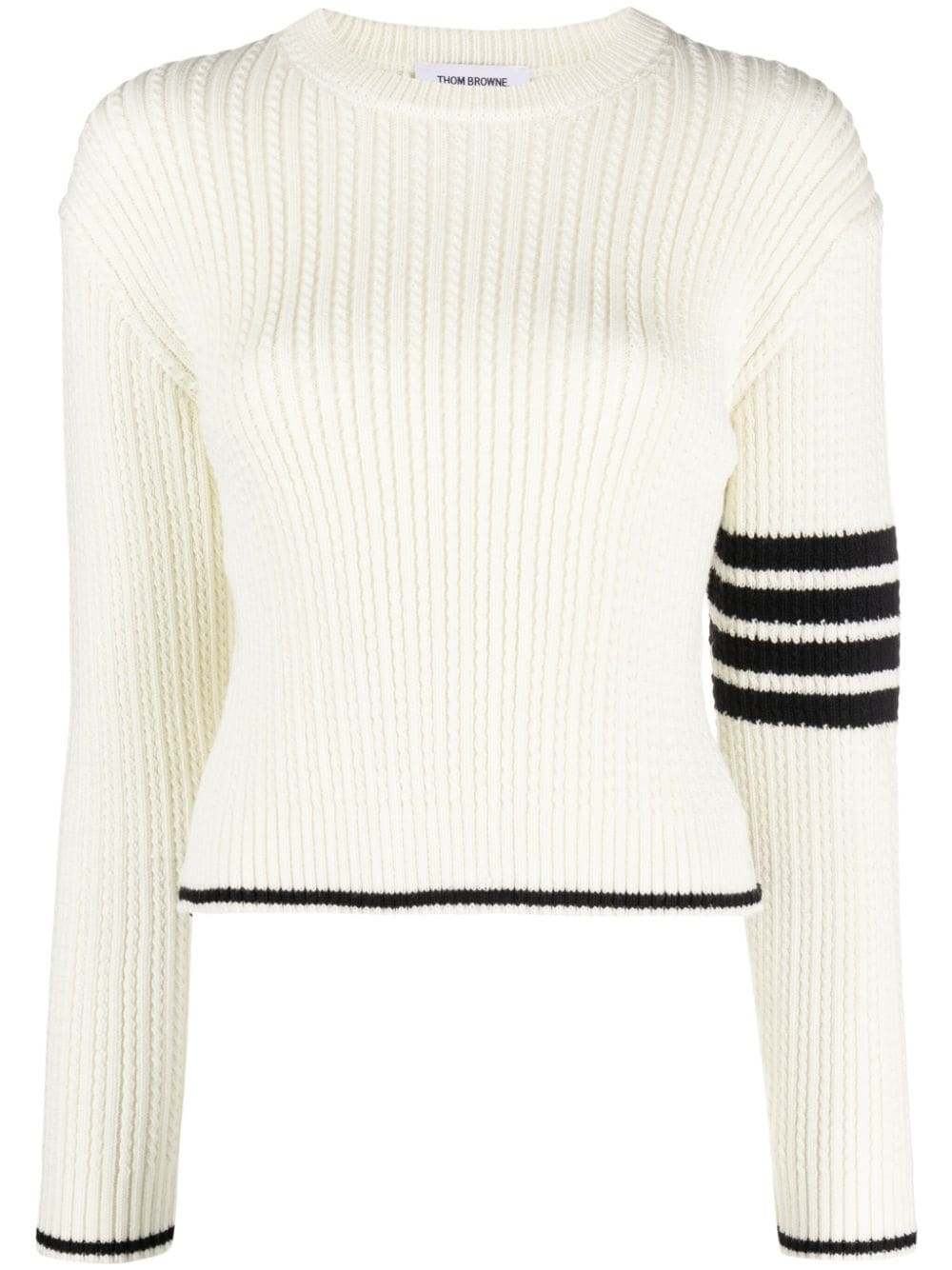 stripe-detailing cable-knit jumper Highlights - White/black - Virgin wool - Knitted construction - Cable knit - Stripe detailing - Striped edge - Signature grosgrain loop tab - Crew neck - Long sleeves - Ribbed cuffs - Signature grosgrain side button fastening - Ribbed hem Imported Composition Virgin Wool 100% SIZE & FIT Model measurements Height 5 ft 9 in(1.76 m) Bust/Chest 31.88 in(81 cm) Hips 35.43 in(90 cm) Waist 24.8 in(63 cm) Measurement LENGTH 19.29 in(49 cm) WAIST 26.77 in(68 cm) SLEEVE LENGTH 22.83 in(58 cm) FittingInformation Designed for a slim fit that sits just away from the body offering a close yet comfortable fit Made with a midweight knit, this piece offers some stretch This piece fits true to size – take your usual size