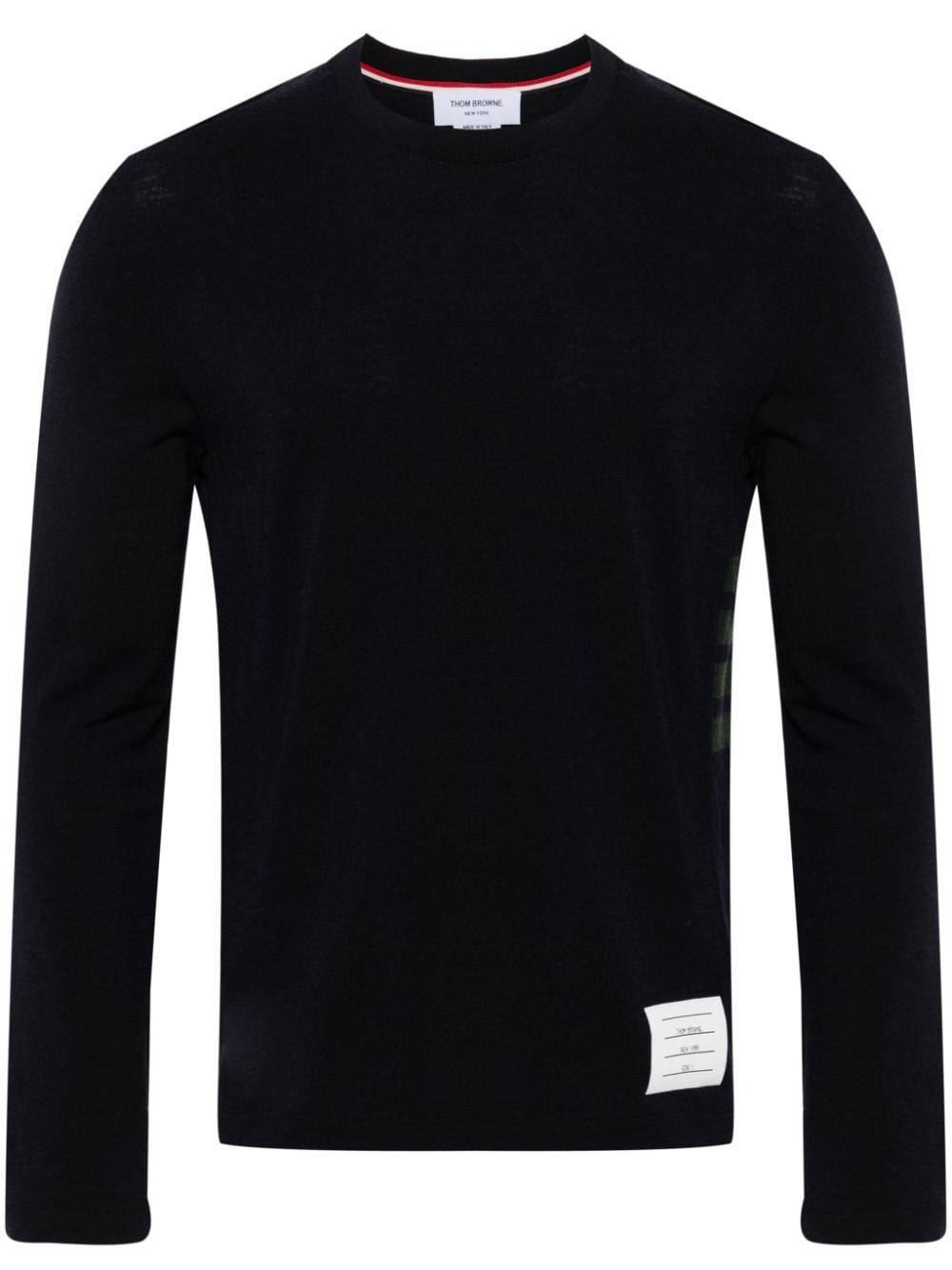4-Bar Stripe intarsia-knit jumper Highlights - Midnight blue/dark green - Stretch-wool - Jersey texture - Logo patch to the front - Stripe detailing to the side - Signature grosgrain loop tab - Crew neck - Long sleeves - Straight hem Made in Italy Composition Wool 97%, Elastane 3% SIZE & FIT Model measurements Height 6 ft 2 in(1.87 m) Bust/Chest 38.18 in(97 cm) Hips 36.61 in(93 cm) Waist 29.13 in(74 cm) FittingInformation Designed for a relaxed fit, this piece allows for comfort and movement when worn Made from a midweight fabric This piece fits true to size – take your usual size
