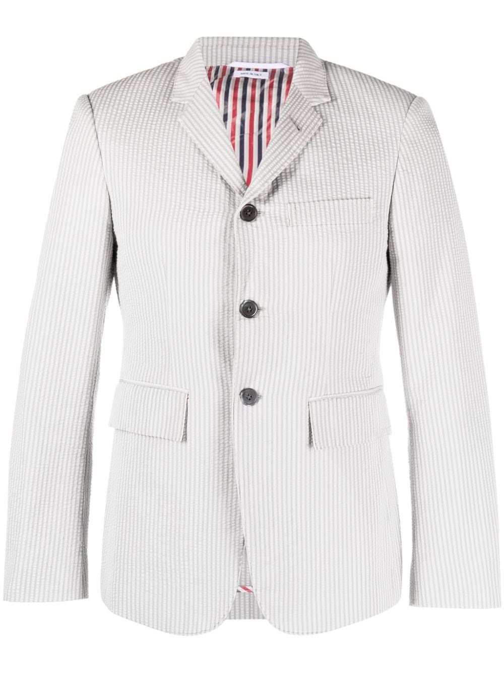 stripe-print seersucker cotton blazer A seersucker texture adds a tactile finish to this Thom Browne's single-breasted blazer, made in Italy from cotton and cut to a tailored silhouette. Fitted with notched lapels, it is half-lined with the house's iconic RWB stripe print throughout. Highlights - White/grey - Cotton - Seersucker texture - Vertical stripe print - Notched collar - Front button and zip fastening - Chest welt pocket - Two side flap pockets - Long sleeves - Buttoned cuffs - Italian rear vents - Rwb stripe lining Made in Italy Composition Outer: Cotton 100% Lining: Cupro 100% SIZE & FIT Model measurements Height 6 ft 2 in(1.87 m) Bust/Chest 38.18 in(97 cm) Hips 36.61 in(93 cm) Waist 29.13 in(74 cm) FittingInformation Designed for a slim fit, offering a comfortable fit that sits just away from the body Made from a midweight non-stretch fabric This piece fits true to size – take your usual size Washing instructions Dry Clean Only
