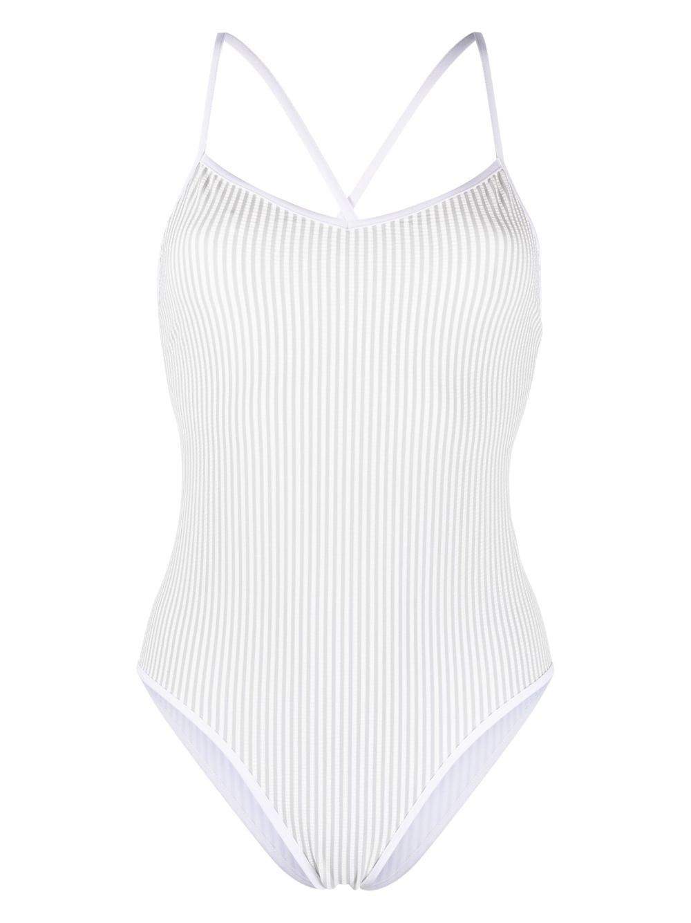 stripe-print seersucker swimsuit Highlights - Light grey/white - Stretch-design - Vertical stripe print - Seersucker texture - Adjustable shoulder straps - Rear criss-cross straps - Signature grosgrain loop tab - Be mindful to try on swimwear over your own garments. Made in Italy Composition Outer: Polyester 69%, Polyamide 21%, Elastane 10% Lining: Polyamide 73%, Elastane 27% Washing instructions Hand Wash