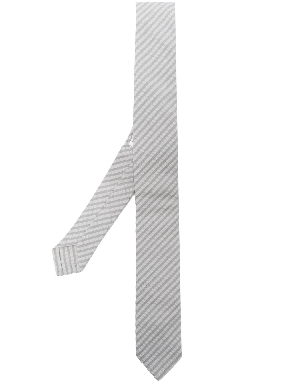stripe seersucker-texture cotton tie Spun from grey and white colour cotton, a diagonal stripe pattern adorns this Thom Browne tie's seersucker texture. Highlights - Grey/white - Cotton - Seersucker texture - Diagonal stripe pattern - Pointed tip - Adjustable fit Made in Italy Composition Outer: Cotton 100% Washing instructions Dry Clean Only
