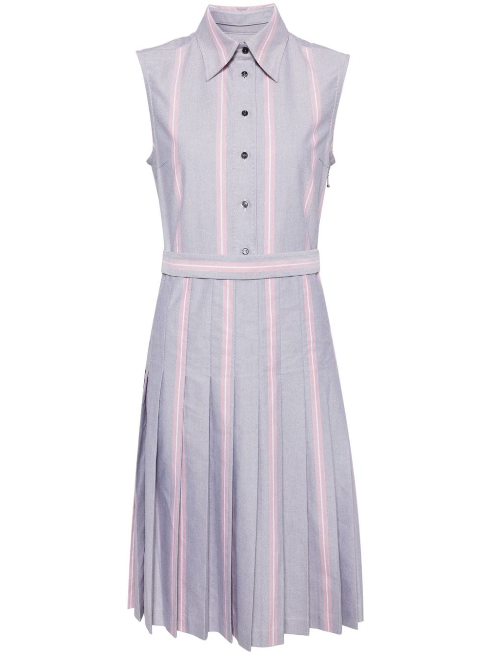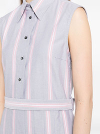 striped belted dress Highlights - Red/grey/white - Cotton - Rwb stripe - Pointed flat collar - Short front button fastening - Concealed side zip fastening - Sleeveless - Belt loops - Detachable and adjustable waist belt - Pleated skirt - Mid-length Made in Italy Composition Body: Cotton 100% Trims: Cotton 100% SIZE & FIT Model measurements Height 5 ft 10 in(1.77 m) Bust/Chest 27.95 in(71 cm) Hips 34.64 in(88 cm) Waist 22.83 in(58 cm) FittingInformation Designed for a slim fit that sits just away from the body offering a close yet comfortable fit The belt offers adjustability for fitted preferences Made from a midweight non-stretch fabric This piece fits true to size – take your usual size Measurement HIPS 35.43 in(90 cm) LENGTH 40.94 in(104 cm) WAIST 31.49 in(80 cm) BUST 34.64 in(88 cm) Shoulder Width 15.74 in(40 cm)