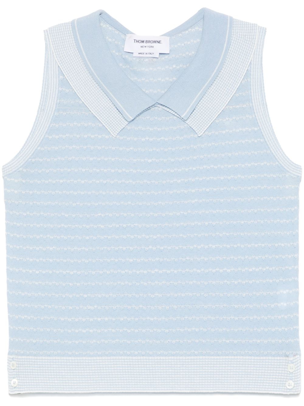 striped double-collar vest Highlights - Sky blue - Side button fastening - Ribbed hem - Logo tag Made in Italy Composition Cotton 58%, Linen/Flax 21%, Silk 21% SIZE & FIT Model measurements Height 5 ft 11 in(1.8 m) Bust/Chest 32.67 in(83 cm) Hips 36.22 in(92 cm) Waist 24.4 in(62 cm) FittingInformation Designed for a slim fit that sits just away from the body offering a close yet comfortable fit Made with a lightweight knit, this piece offers some stretch