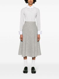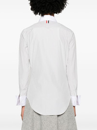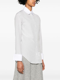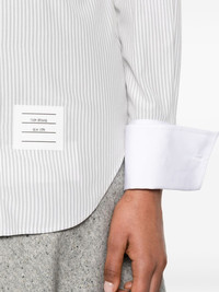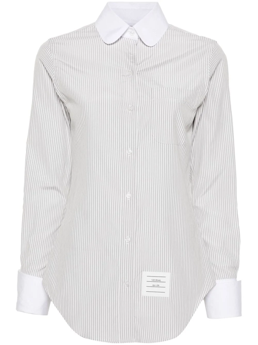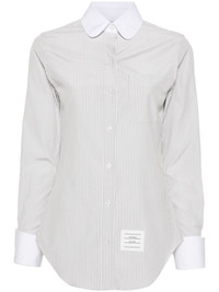 striped rounded-collar shirt Highlights - Grey/white - Cotton-silk blend - Poplin texture - Vertical stripe pattern - Logo patch to the side - Signature grosgrain loop tab - Contrasting rounded collar - Front button fastening - Long sleeves with french cuffs - Chest patch pocket - Curved hem Made in Italy Composition Silk 66%, Cotton 34% SIZE & FIT Model measurements Height 5 ft 10 in(1.77 m) Bust/Chest 33.07 in(84 cm) Hips 37 in(94 cm) Waist 24.8 in(63 cm) FittingInformation Designed for a slim fit that sits just away from the body offering a close yet comfortable fit Made from a midweight non-stretch fabric This piece fits true to size – take your usual size