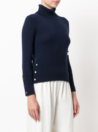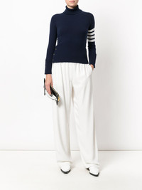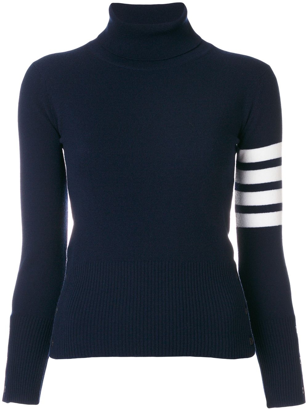striped turtleneck sweater As renowned for his beloved knitwear as he is for his boundary-pushing tailoring, this knitted top finds Thom Browne editing a familiar favourite with more athletically-inclined detailing. Crafted in the United Kingdom from blue soft cashmere, this sophisticated jumper features a turtle neck, long sleeves, button cuffs, a ribbed hem and cuffs, 4-bar stripes at the sleeve, red, white and blue grosgrain cuff detail and back yoke tab, side buttoned slits and Mother of Pearl buttons. Made in United Kingdom Composition Cashmere 100% SIZE & FIT Model measurements Height 5 ft 10 in(1.79 m) Bust/Chest 32.67 in(83 cm) Hips 33.46 in(85 cm) Waist 24.01 in(61 cm) Measurement SLEEVE LENGTH 27.16 in(69 cm) Shoulder Width 12.59 in(32 cm) LENGTH 20.07 in(51 cm) WAIST 25.19 in(64 cm) BUST 28.34 in(72 cm)