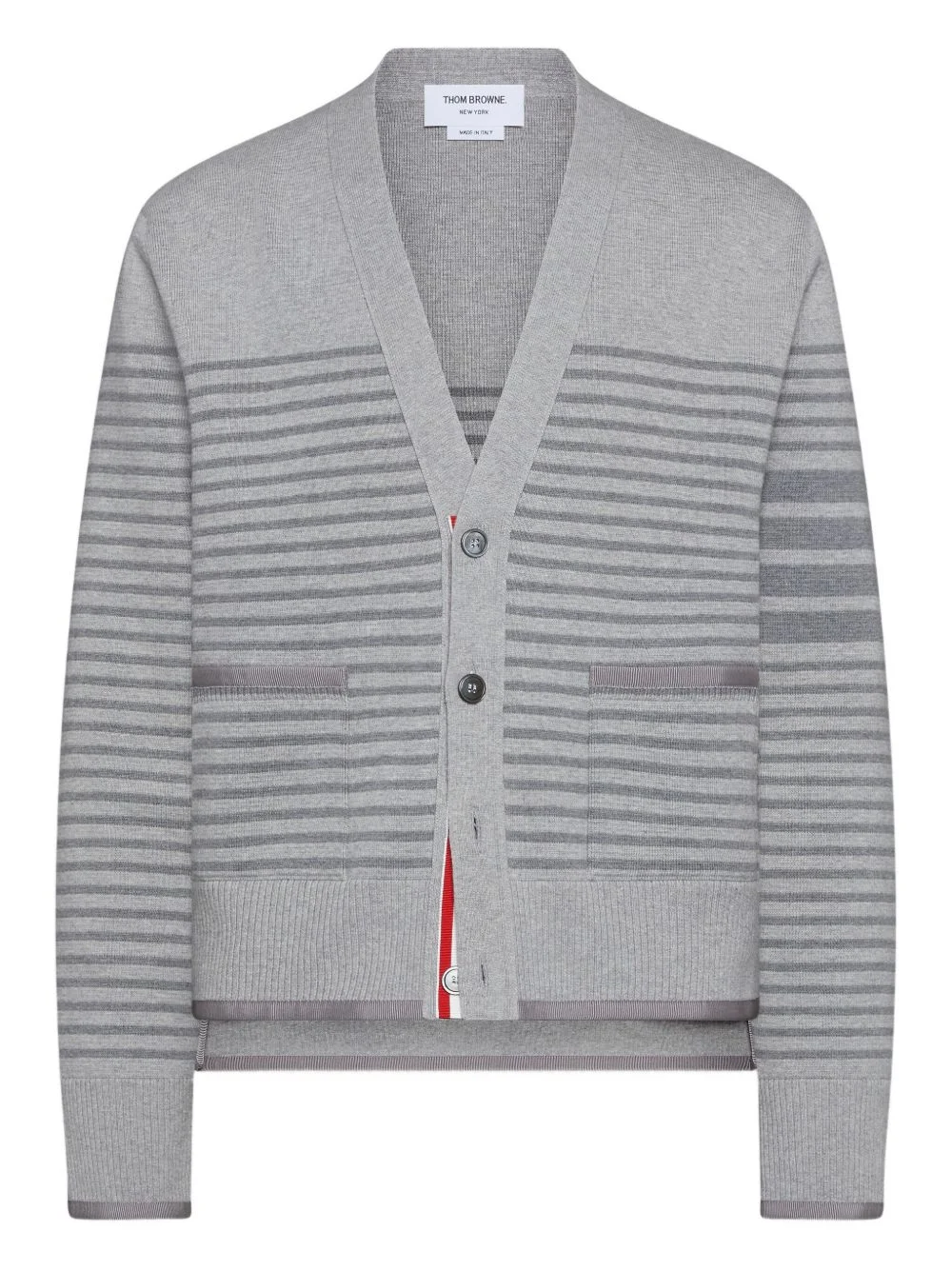 striped V-neck cardigan Highlights - Grey - Striped - V-neck - Front button fastening - Two front patch pockets - Buttoned cuffs Made in Italy Composition Fabric 100% Washing instructions Read Manufacturer Guidelines