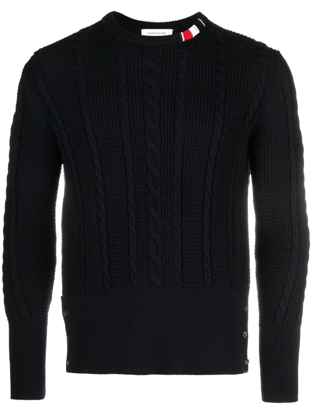 RWB-stripe cable-knit wool jumper Crafted from luxurious virgin wool, this striped shirt by Thom Browne is punctuated with the brand's signature red, blue and white striped grosgrain on the sleeves for a recognisable finish. Highlights - Blue/white - Virgin wool - Classic collar - Signature grosgrain loop tab - Front button fastening - Chest patch pocket - Long sleeves - Signature 3-stripes logo - Buttoned cuffs - Logo patch to the front - Curved hem Imported Composition Virgin Wool 100% SIZE & FIT Model measurements Height 6 ft 2 in(1.89 m) Bust/Chest 37.4 in(95 cm) Hips 37.4 in(95 cm) Waist 29.52 in(75 cm) FittingInformation Designed for a regular fit, offering a comfortable loose fit throughout the body Made from a midweight non-stretch fabric This piece fits true to size – take your usual size