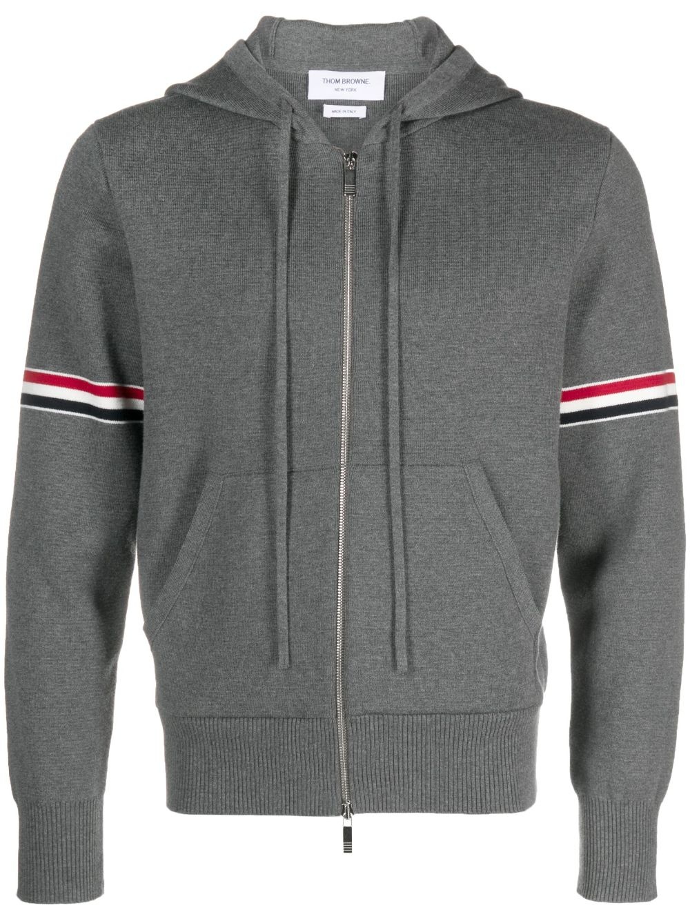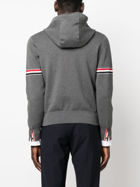 striped zip-up hoodie Thom Browne showcases its minimalist style with this long-sleeved hoodie from the brand's SS24 collection. In addition to being presented on the sleeves of this piece, the brand's signature stripes also appear on the cuffs of this hoodie, alongside button-fastenings. This detailing reiterates the impeccable craftsmanship that the brand is known for. Highlights - Medium grey - Cotton - Rwb stripe - Drawstring hood - Long sleeves - Buttoned cuffs - Front zip fastening - Front pouch pocket Made in Italy Composition Outer: Cotton 100% SIZE & FIT Model measurements Height 6 ft 2 in(1.87 m) Bust/Chest 36.41 in(92.5 cm) Hips 37 in(94 cm) Waist 29.52 in(75 cm) FittingInformation Designed for a relaxed fit, this piece allows for comfort and movement when worn Made with a midweight knit, this piece offers some stretch This piece fits true to size – take your usual size Measurement CHEST 41.73 in(106 cm) LENGTH 24.8 in(63 cm) SLEEVE LENGTH 25.59 in(65 cm)