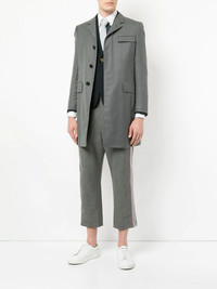 Super 120s Chesterfield overcoat No more casual Fridays at the office. This Super 120s Chesterfield overcoat from Thom Browne will make you want to suit up every day of the week. Show them you mean business. Featuring a front button placket, a notched collar, side flap pockets, a broad welt chest pocket, a double vent to the rear and button cuffs. Made in Italy Composition Wool 100% SIZE & FIT Model measurements Height 6 ft 3 in(1.9 m) Bust/Chest 37.4 in(95 cm) Hips 35.43 in(90 cm) Waist 29.92 in(76 cm) Washing instructions Dry Clean Only