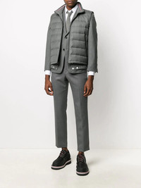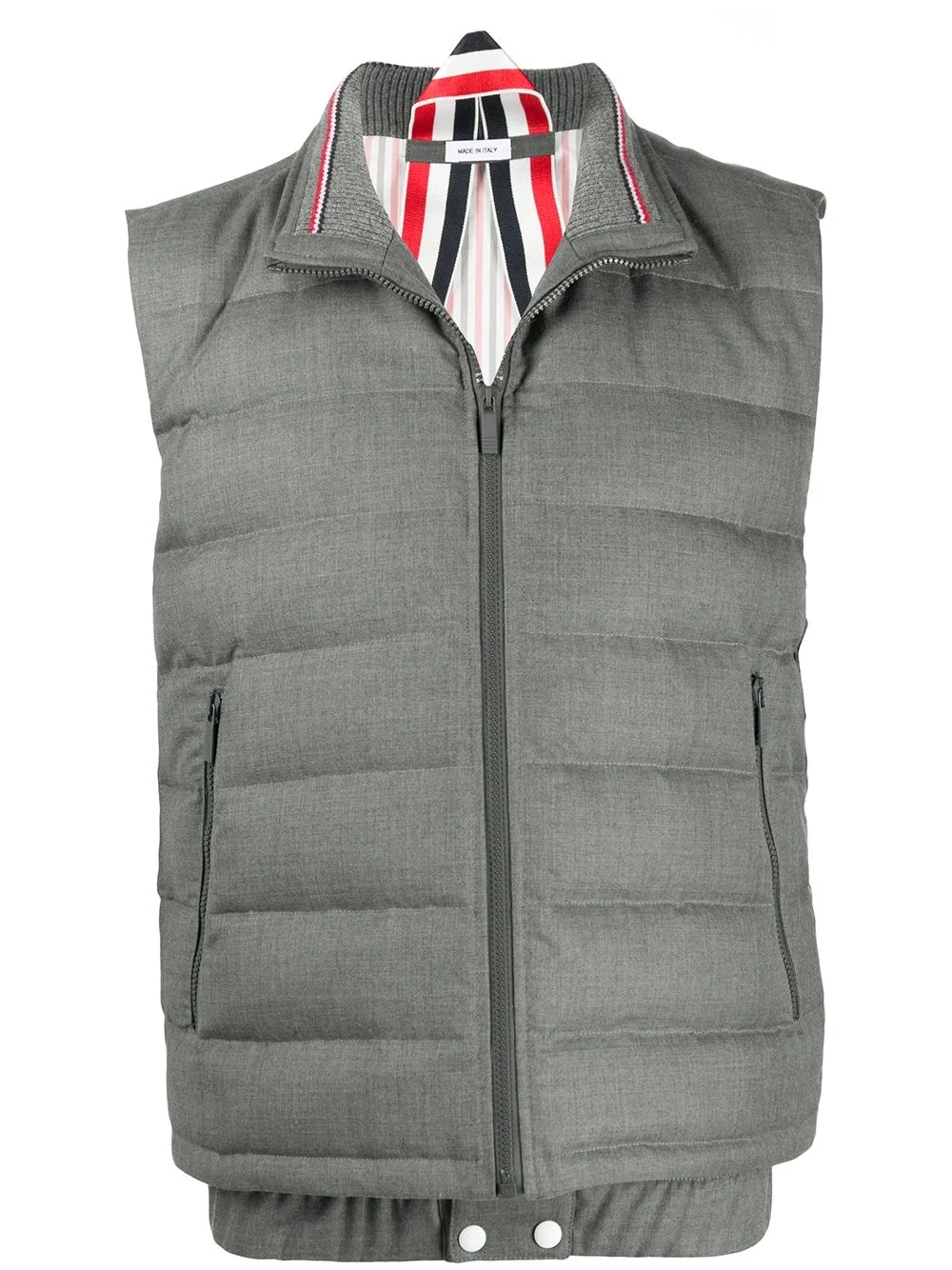 super 120s down-filled ski vest Have you said "gilet" lately? It's got such a nice ring to it, try it out. Next, try this out: "Thom Browne gilet with a down filling". Ooh, that sounds Highlights - Medium grey - Feather/goose down-blend - High neck - Front zip fastening - Quilted - Two zip-fastening pockets - Snap-button fastening - Elasticated hem - Signature 4-bar tab Made in Italy Composition Polyester 50%, Goose Down 40%, Feather 10% SIZE & FIT Model measurements Height 6 ft 2 in(1.88 m) Bust/Chest 36.61 in(93 cm) Hips 35.82 in(91 cm) Waist 27.95 in(71 cm) Measurement CHEST 48.03 in(122 cm) Shoulder Width 18.89 in(48 cm) FittingInformation This piece fits true to size. We recommend you get your regular size Cut for a slim fit Made with a mid-weight non-stretch fabric Washing instructions Dry Clean Only