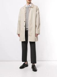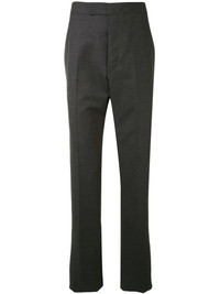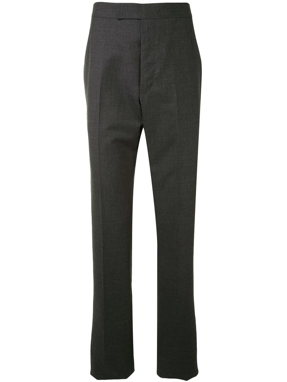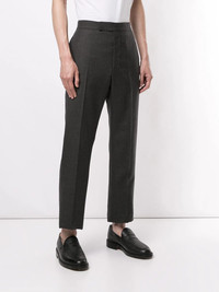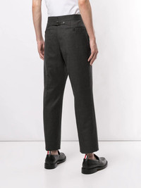 super 120s twill classic backstrap trousers You can't go wrong with Thom Browne's classic backstrap trousers. Crafted in Italy from dark grey super 120s twill, the pair's leg is cropped thanks to an upturned hem. Perfect to show off those ankles. Featuring a straight leg, a high rise, a concealed front fastening, a back slit strap, two back buttoned welt pockets, a turned up hem and a cropped length. Made in Italy Composition Lining: Polyester 65%, Cotton 35% Outer: Wool 100% SIZE & FIT FittingInformation Designed for a straight-leg, allowing for an unrestricted and comfortable fit over the leg The unfinished hems allow for the length to be altered Made from a midweight non-stretch fabric This piece fits large – take one size down Measurement INSIDE LEG 37 in(94 cm) FRONT RISE 11.81 in(30 cm) HIPS 40.94 in(104 cm)
