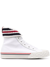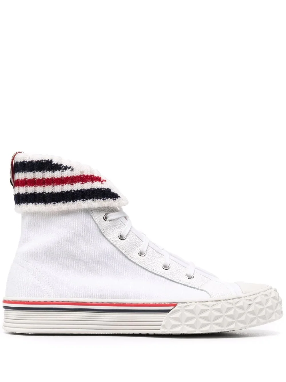 tartan-sole RWB stripe sneakers Striped motifs make a recurrent appearance in Thom Browne’s collections and have become signature symbols of the brand’s aesthetic. Called RWB, the striped theme seen on these high-top sneakers adds an unmistakable look to their high-top design. Made in Italy Composition Lining: Leather 100% Outer: Canvas 100% Sole: Rubber 100% SIZE & FIT Model measurements Height 6 ft 2 in(1.88 m) Bust/Chest 36.61 in(93 cm) Hips 35.82 in(91 cm) Waist 27.95 in(71 cm)