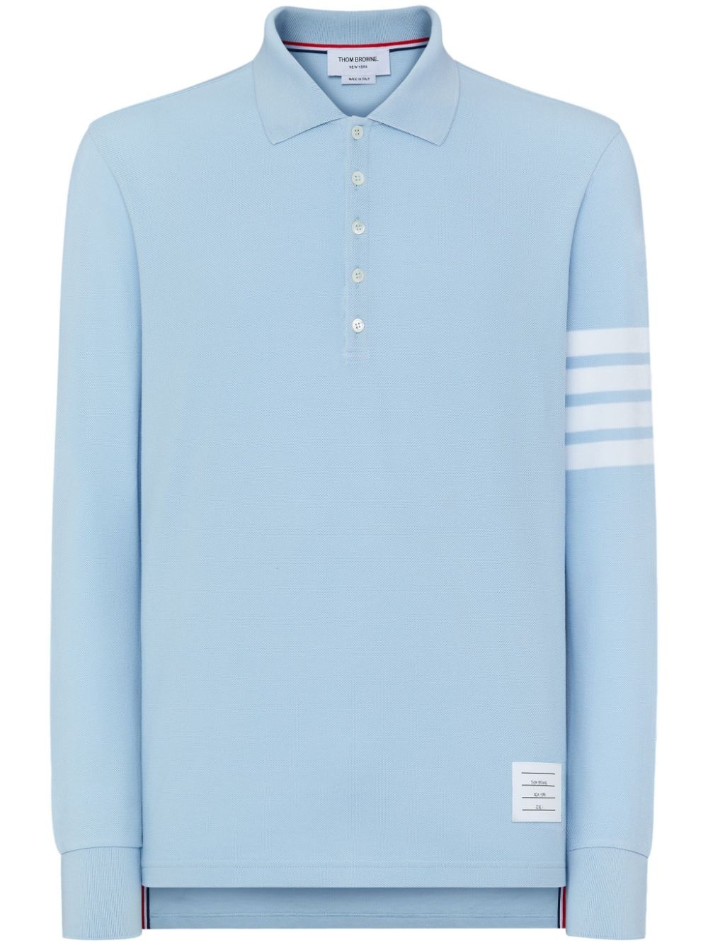 three-stripe long-sleeved polo shirt Highlights - Sky blue/white - Cotton - Stripe detailing - Logo tag - Polo collar - Front button placket - Long sleeves - Ribbed cuffs - High-low hem Made in Italy Composition Cotton 100% SIZE & FIT FittingInformation Designed for a relaxed fit, this polo shirt offers comfort and movement Made from a midweight non-stretch fabric, this piece offers minimal elasticity when worn