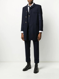 tonal 4-Bar flannel trousers As Oscar Wilde once said, "you can never be overdressed or overeducated." Make sure you follow that wise piece of advice and incorporate these navy wool-cashmere blend tonal 4-Bar flannel trousers from Thom Browne into your daily looks. Suit up! Featuring an off-centre front button fastening, a rolled hem, a cropped length, a slim fit, rear welt pockets, side slit pockets and a signature tri-colour striped trim. Made in Italy Composition Wool 95%, Cashmere 5% SIZE & FIT Model measurements Height 6 ft 2 in(1.88 m) Bust/Chest 36.61 in(93 cm) Hips 35.82 in(91 cm) Waist 27.95 in(71 cm) FittingInformation This piece fits true to size. We recommend you get your regular size Regular fit Made with a mid-weight non-stretch fabric Measurement INSIDE LEG 36.61 in(93 cm) FRONT RISE 14.56 in(37 cm) HIPS 48.03 in(122 cm) Washing instructions Dry Clean Only