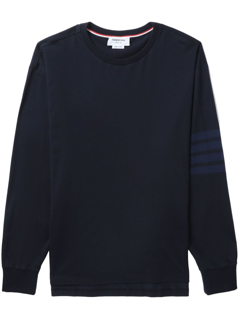 4-Bar stripe cotton T-shirt Highlights - Navy blue - Cotton - Signature 4-bar stripe - Signature grosgrain loop tab - Logo patch to the front - Rwb stripe - Crew neck - Long sleeves - Side slits - High-low hem Imported Composition Cotton 100% SIZE & FIT Model measurements Height 6 ft 2 in(1.87 m) Bust/Chest 38.18 in(97 cm) Hips 36.61 in(93 cm) Waist 29.13 in(74 cm) Measurement CHEST 48.81 in(124 cm) SLEEVE LENGTH 25.19 in(64 cm) FittingInformation This piece fits true to size. We recommend you get your regular size Cut for a relaxed fit Made with a mid-weight fabric Washing instructions Dry Clean Only