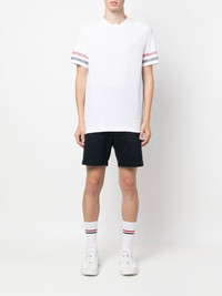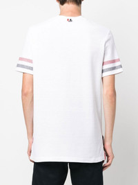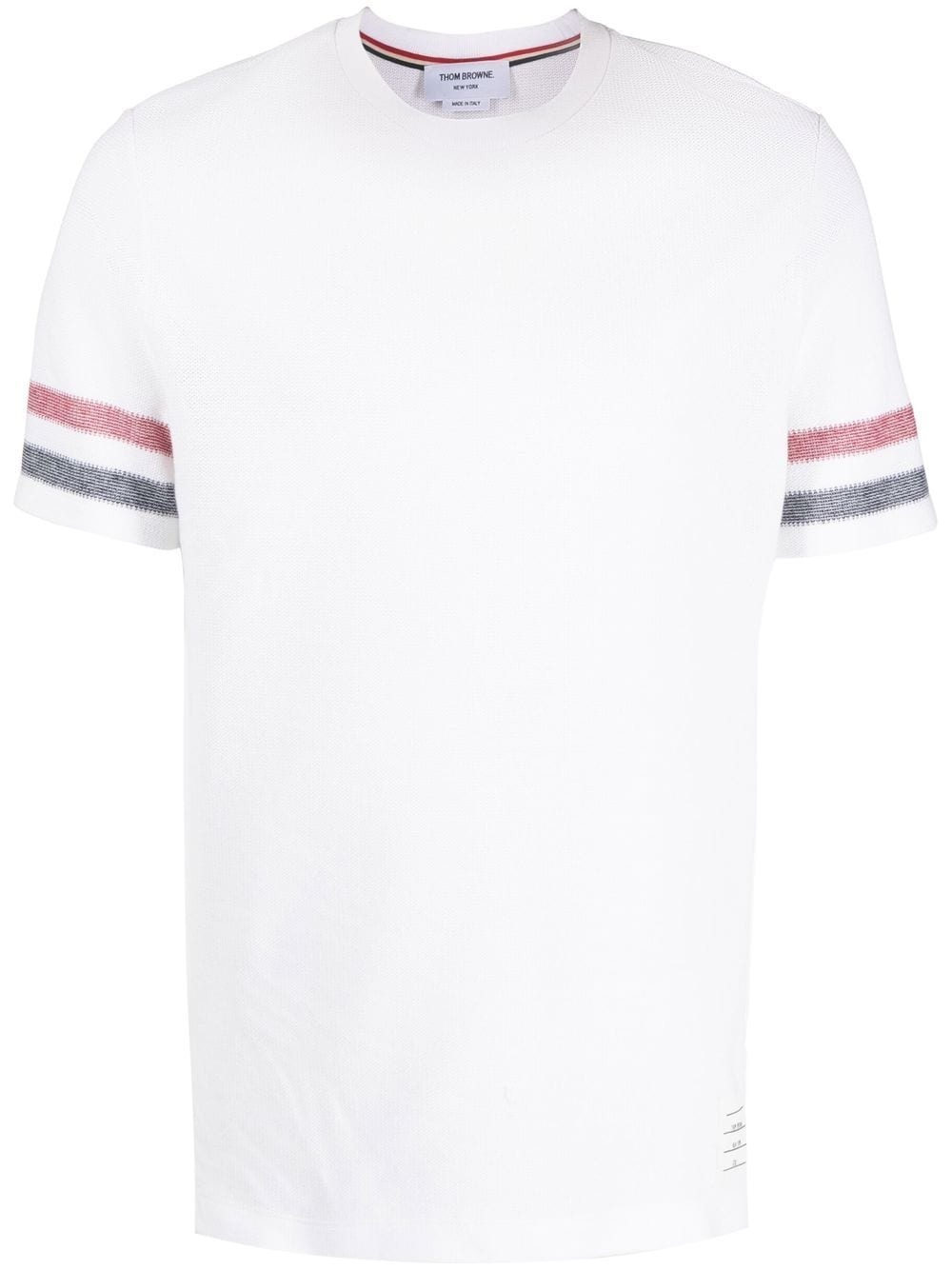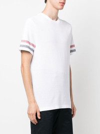 tri-colour striped knit T-shirt tri-colour striped knit T-shirt from THOM BROWNE featuring white, cotton, knitted construction, logo patch to the front, signature tricolour detail, signature grosgrain loop tab, crew neck, short sleeves, striped edge, straight hem and side stripe detailing. Made in Italy Composition Cotton 100% SIZE & FIT Model measurements Height 6 ft 2 in(1.87 m) Bust/Chest 35.82 in(91 cm) Hips 35.43 in(90 cm) Waist 27.95 in(71 cm) Measurement CHEST 44.09 in(112 cm) SLEEVE LENGTH 18.5 in(47 cm) FittingInformation This piece fits true to size. We recommend you get your regular size Cut for a relaxed fit Made with a mid-weight fabric