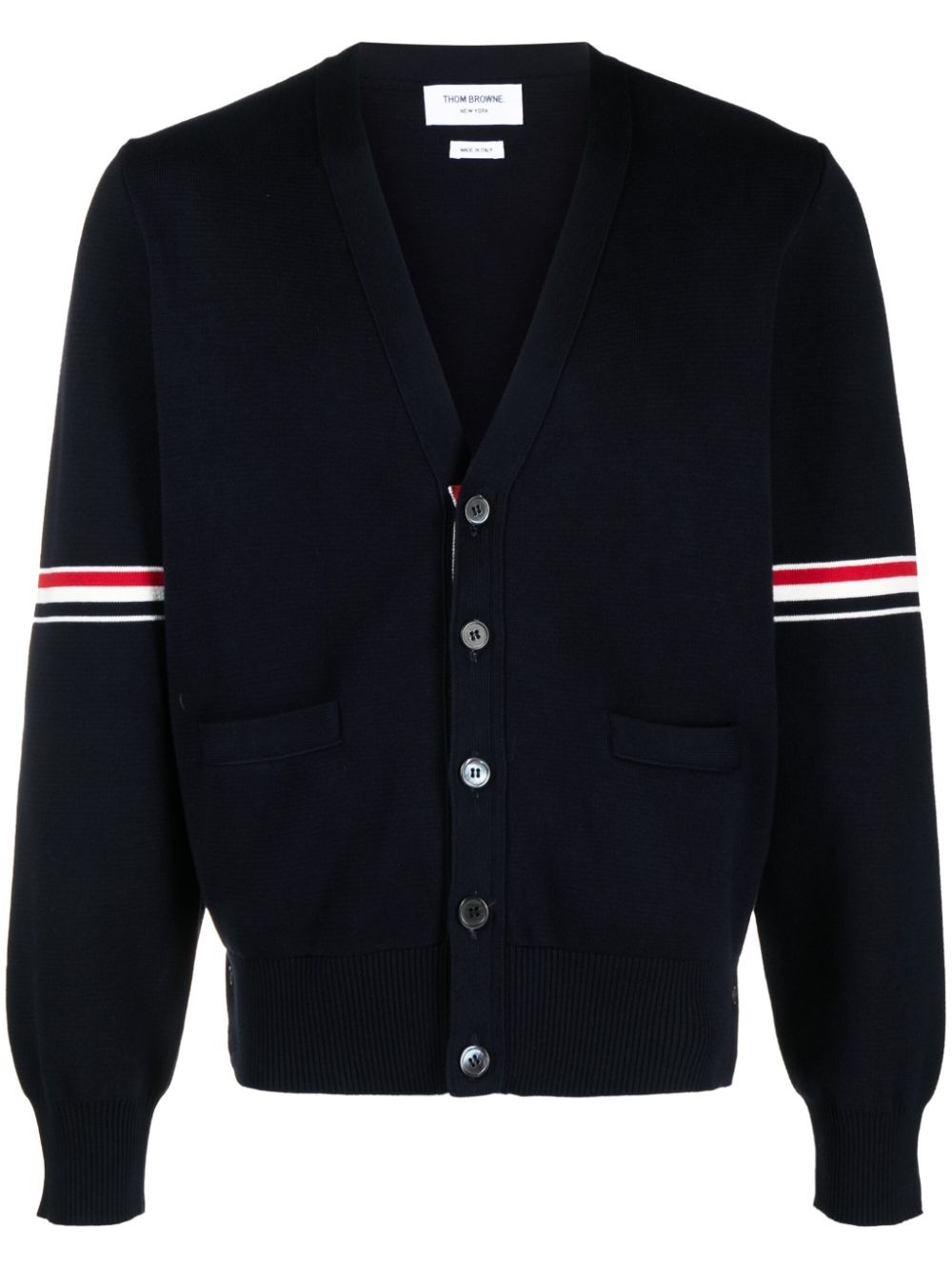 tricolour 4-Bar cardigan There are approximately eight million things to talk about when it comes to this Thom Browne cardigan, but we'd like to concentrate on the Milano stitching. If you look closely, the textured weaving is the result of two yarns being knit diagonally. We always knew that, and Highlights - Navy/white/red - Cotton - V-neck - Front button fastening - Two front patch pockets - Signature 4-bar stripe - Signature 4-bar tab - Long sleeves - Buttoned cuffs - Side button fastening - Ribbed detailing Made in Italy Composition Cotton 100% SIZE & FIT Model measurements Height 6 ft 2 in(1.89 m) Bust/Chest 39.76 in(101 cm) Hips 37.4 in(95 cm) Waist 29.92 in(76 cm) Measurement CHEST 41.73 in(106 cm) SLEEVE LENGTH 32.48 in(82.5 cm) LENGTH 24.4 in(62 cm) FittingInformation Designed for a relaxed fit, this piece allows for comfort and movement when worn Made with a midweight knit, this piece offers some stretch This piece fits true to size – take your usual size Washing instructions Hand Wash