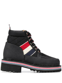 tricolour stripe hiking boots As A.A. Milne once said, "When you see someone putting on their big boots, you can be pretty sure that an adventure is going to happen". And we honestly believe he was referring to these black tricolour stripe hiking boots from Thom Browne. Ready for your next adventure? Featuring a round toe, a lace-up front fastening, a pull tab at the rear, a ridged rubber sole, an ankle length and a 4-bar detail to the sides and to the sole. Made in Italy Composition Outer: Polyamide 60%, Rubber 30%, Calf Leather 10% SIZE & FIT Measurement HEEL 2.36 in(6 cm) HEIGHT 5.9 in(15 cm) Sole height 1.57 in(4 cm)